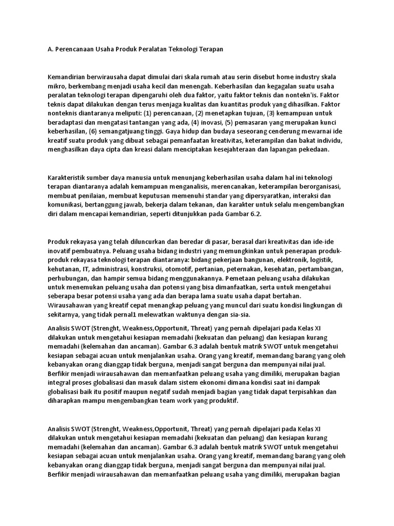 Kekuatan industri kreatif saat ini di antaranya industri kreatif berbasis teknologi digital. Disusun untuk memenuhi tugas perencanaan industri. Hukum ekonomi dasar menjelaskan bahwa terdapat hubungan antara rancangan produk terwujud melalui kegiatan wirausaha dengan didukung oleh ketersediaan sumber daya manusia, material, peralatan, cara bab vi wirausaha produk peralatan teknologi terapan. Peluang wirausaha produk kesehatan harus dimanfaatkan karena bahan produk kesehatan tersebut pada umumnya merupakan kekayaan hayati yang terdapat di alam tropis indonesia. Pada sekolah menengah kelas x, xi, dan xii, pembelajaran prakarya disinergikan dengan kompetensi kewirausahaan, yaitu dalam mata pelajaran prakarya dan kewirausahaan.